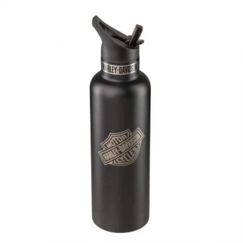 Harley-Davidson® Bar & Shield Water Bottle. Size: 23 oz. Double-wall stainless steel (vacuum insulated) black water bottle. Laser engraved silver Bar & Shield logo and Harley-Davidson® on bottle neck. Plastic lid with straw creates leak resistant seal when closed and doubles as handle for carrying. Dishwasher safe.