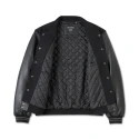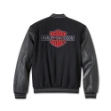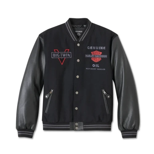 Sporty H-D style takes a nostalgic turn on the V-Twin Varsity Leather Jacket. This limited issue is crafted from a blend of supple leather and fabric for lasting comfort and durability, plus it’s insulated for added warmth. It features secure pocket space, including a snap-closed inside pocket for stashing essentials, and rib-knit trim for shape-keeping stretch. What gives this men’s jacket its elevated look are graphics that honor elements of our moto history like the 1930s oil can and the “Big Twin” from a 1950s poster. Order yours ASAP before they’re gone.