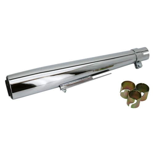 Universal muffler with a well proportioned fixed baffle. Fits on 1 7/8" (48mm) diameter or smaller headers. Comes complete with reduction sleeves for use on 1 3/8" (35mm), 1 1/2" (38mm) and 1 5/8" (42mm) headers. A muffler clamp and universal bracket that bolts to the mounting tunnel is also included. Muffler is 20" (51 cm) long and is 3" (7.5 cm) in diameter at the end. Can be used left or right. Sold each.