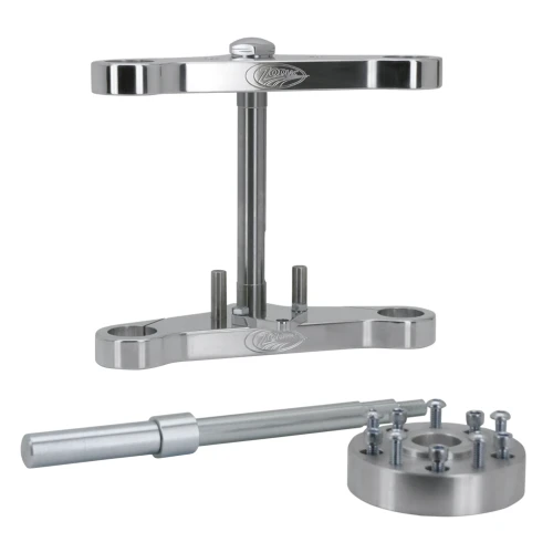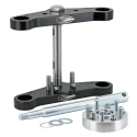 These billet aluminum kits have the same features as our other Rev"O"lution Mid Glide kits but as an extra they feature "extra thick" 25mm top and bottom plates. Available in stock, 3 degrees and 6 degrees rake. Raked kits allow the use of 4 to 10" (10 to 25cm) over-stock fork tubes, still keeping the bottom frame tube level with the ground, giving your bike that extended look. Machined from billet aircraft quality aluminum and include all necessary hardware and a bracket for a bottom mount headlight. The kit for 1977-1986 FX with 35mm fork tubes and includes two disc spacers. This kit can also be used for Sportster models with 35mm forks if steering stop is modified and neck post is spaced to correct length. For all other dual disc applications you have to order one extra spacer.