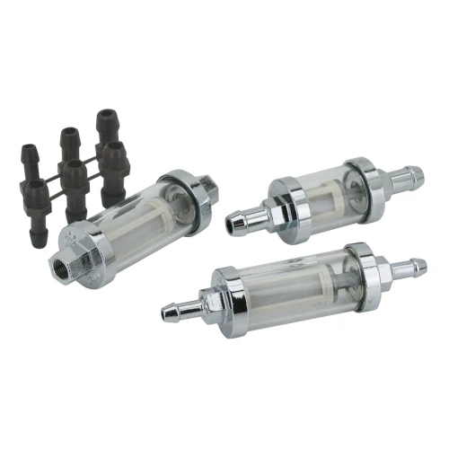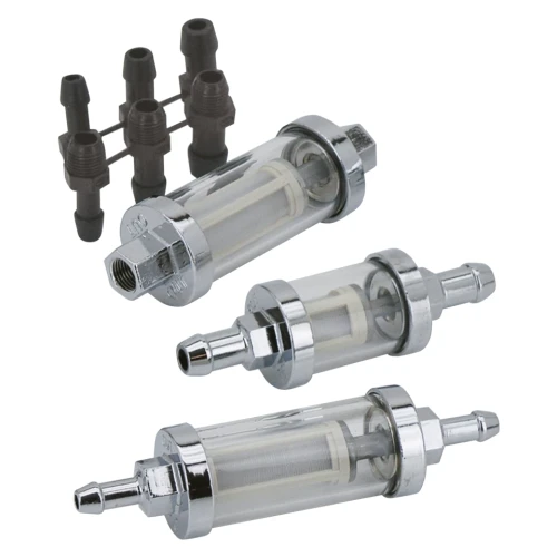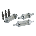 Show chromed in-line fuel filter. Features clear housing and new type washable filter element. Filters paint, flecks, dirt etc. A must when you have a spray job done on your tank. Available for 1/4" (6.5mm), 5/16" (8mm) and 3/8" (10mm) fuel line. For custom applications we offer a multi fit fuel filter. These multi fit filters contain 6 fittings, 1/4", 5/16" and 3/8" two of each. The short filters measure 1 11/16" (42mm), the long filters measure 2 7/16" (62mm) in lenght.