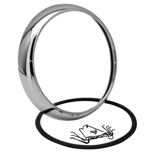 Headlight trim ring is supplied including rubber gasket (OEM 67716-60A), retaining clips (OEM 67778-60, 67779-60, 67780-60) and screw (OEM 67718-60A). Fits 1960-1965 Panhead and 1966-1984 four-speed Shovelhead. Also stock replacement for our headlight nacelle kits ZPN 160007, 160008 and 237336.