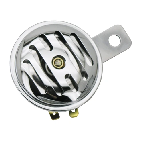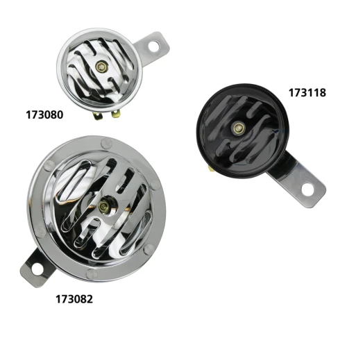 These "Universal use" 12V horn work with all 12 Volt bikes. Available with a grooved or classic style cover. Don't let the small size fool you, these horns produce 100 Decibels.