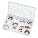 Shop kit of commonly used retaining rings in a virtually unbreakable tray. Ideal for shop use. Tray contains 110 pieces of commonly used rings as listed below. Individual retaining rings are also available.