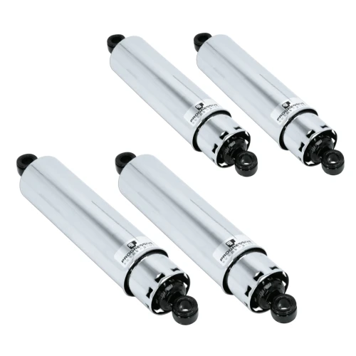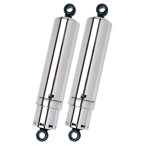 Progressive Suspension shocks are real quality and feature chrome or black powder coat finish, double wall construction, 6-stage damping, heat-treated hardchrome rods, long-life seals and fade resistant oil. Shocks come with a one year warranty on the shocks and a lifetime warranty on the springs. Sold in pairs. Available in various designs with the same technical details. Shocks with Regular springs will accommodate most riders needs. For some models we also have shocks with Heavy-Duty springs available. Springs for those who want to upgrade from Regular to Heavy-Duty are listed elsewhere in this chapter. Your model motorcycle is given together with the stock shocks length, feel free to take longer or shorter shocks from the same application group, but note that shorter than stock shocks will lower the rear of the motorcycle. Fender to tire clearance should be checked after installation.