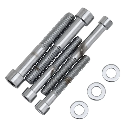 Chrome Allen head screws that hold the sprocket cover to the engine. Allen heads are also known as hex socket cap screws.