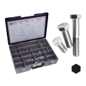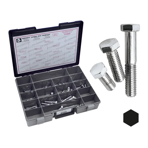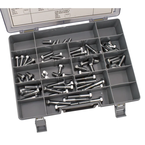 Assortment tray of grade 5 Hex head capscrews. Tray contains 65 pieces 7/16" and 1/2" UNC screws in 13 sizes. Each size can be ordered in individual 5 packs.