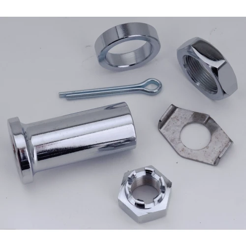 The widest selection of Chrome plated front and rear axles available today is offered to you by Zodiac. Axles for models as far back as 1936 and as recent as the latest models. Axle shaft is machined from heat treated Chrome-moly steel, triple Chrome plated, machine polished and then ground (after chroming) to a size tolerance of ±.0005". Rear axle nuts are penetration welded to the shaft and smoothly machined before polishing and plating. Please note that recent models often use the same OEM part number for the wheel axle, our kits however include the correct axle spacers for the models as listed.
