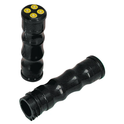 For those that want something really special. These Magnum Police Special grip sets are decorated with genuine Magnum cartridge cases. Grips are manufactured from billet aluminum and will fit all models 1982 to present except those with fork air reservoirs in the handlebar. You can have the grip set in chrome or black, but the cartridges stay the same. Matching handlebar risers, point covers, end caps for SuperTrapp and gas cap covers for that real "Shooting" finishing touch can be found elsewhere in this catalog.