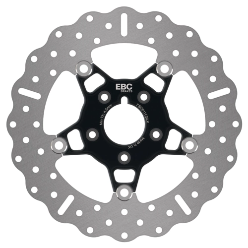 EBC produces a complete range of floating and non-floating disc brake rotors for modern Big Twin and Sportsters. EBC rotors are made in the UK using stainless steel for the brake rotor itself and polished or black stainless steel center hubs. EBC has opted for stainless steel center hubs due to the weight and heavy duty nature of larger American motorcycles. Floating rotors are assembled using the unique EBC SD System square drive button technology. EBC front floating rotors feature 5 buttons whereas rear rotors include 10 drive buttons to provide a sturdy looking and robust unit worthy of its heavy duty application. EBC strongly recommends to always use new pads when replacing rotors as the use of old or worn pads can cause hot spots or glazing of the rotor and will promote brake fade and loss of brake. EBC brake pads can be found elsewhere in this catalog. EBC offers a range of 5 spoke solid brake rotors and a choice of 5 spoke floating rotors in full circle rotor design or contoured profile rotor design. Discs are available in "Wide Band" for use with stock or stock style calipers or "Narrow Band" for use with aftermarket calipers.
