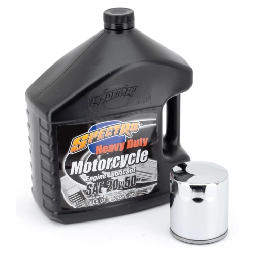 Easy does it! Just one part number to get everything you need for an engine oil change, a complete oil change or an oil change complete with a spark plugs change. We have selected for you the right type of Spectro oils, volumes, right oil filter in black or chrome and put these together in one box. We also have kits that include the correct spark plugs. And for the most demanding riders with a 2006 or later 6-speed transmission we have Platinum Plus kits available that include Spectro's special formulated noise-killing Platinum Gear oil. All kits are available with your choice of chrome plated oil filter or black painted oil filter.