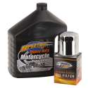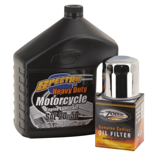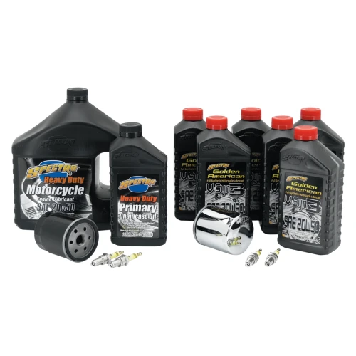 Easy does it! Just one part number to get everything you need for an engine oil change, a complete oil change or an oil change complete with a spark plugs change. We have selected for you the right type of Spectro oils, volumes, right oil filter in black or chrome and put these together in one box. We also have kits that include the correct spark plugs. And for the most demanding riders with a 2006 or later 6-speed transmission we have Platinum Plus kits available that include Spectro's special formulated noise-killing Platinum Gear oil. All kits are available with your choice of chrome plated oil filter or black painted oil filter.