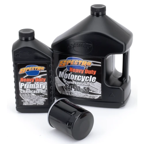 Easy does it! Just one part number to get everything you need for an engine oil change, a complete oil change or an oil change complete with a spark plugs change. We have selected for you the right type of Spectro oils, volumes, right oil filter in black or chrome and put these together in one box. We also have kits that include the correct spark plugs. And for the most demanding riders with a 2006 or later 6-speed transmission we have Platinum Plus kits available that include Spectro's special formulated noise-killing Platinum Gear oil. All kits are available with your choice of chrome plated oil filter or black painted oil filter.