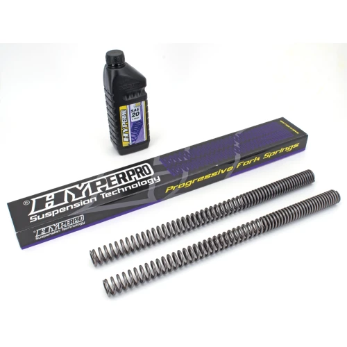 Hyperpro has put years of extensive Research & Development on front forks, shocks, springs and suspension systems. As most of the time a linear spring is either too hard or too soft at the beginning and/or at the end, a so called one-step progressive spring is an improvement, but is still a compromise between comfort and safety. The sudden change from soft to hard is often felt as a disadvantage and can lead to "speed wobbles". Hyperpro came up with the noncompromising solution: the "Link-System Curve Design" for springs. With this construction a spring can be designed to satisfy all the demands of modern motorcycle technology. Hyperpro gives you a sensitive initial part of the stroke with a smoothly increasing spring rate for safety and anti-dive at the end of the stroke. Together with the use of the highest quality materials and precision machining this results in the best springs that money can buy. The fork springs are manufactured to DIN-2095, class 1 and are specially polished for minimal friction and carry a lifetime warranty against breaking. Front fork kits come complete with springs, one liter Hyperpro suspension-fluid, a small tube Hyperpro fork seal lubricant, and a professional manual with suspension tips.