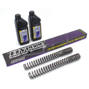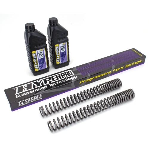 Hyperpro has put years of extensive Research & Development on front forks, shocks, springs and suspension systems. As most of the time a linear spring is either too hard or too soft at the beginning and/or at the end, a so called one-step progressive spring is an improvement, but is still a compromise between comfort and safety. The sudden change from soft to hard is often felt as a disadvantage and can lead to "speed wobbles". Hyperpro came up with the noncompromising solution: the "Link-System Curve Design" for springs. With this construction a spring can be designed to satisfy all the demands of modern motorcycle technology. Hyperpro gives you a sensitive initial part of the stroke with a smoothly increasing spring rate for safety and anti-dive at the end of the stroke. Together with the use of the highest quality materials and precision machining this results in the best springs that money can buy. The fork springs are manufactured to DIN-2095, class 1 and are specially polished for minimal friction and carry a lifetime warranty against breaking. Front fork kits come complete with springs, one liter Hyperpro suspension-fluid, a small tube Hyperpro fork seal lubricant, and a professional manual with suspension tips.