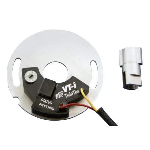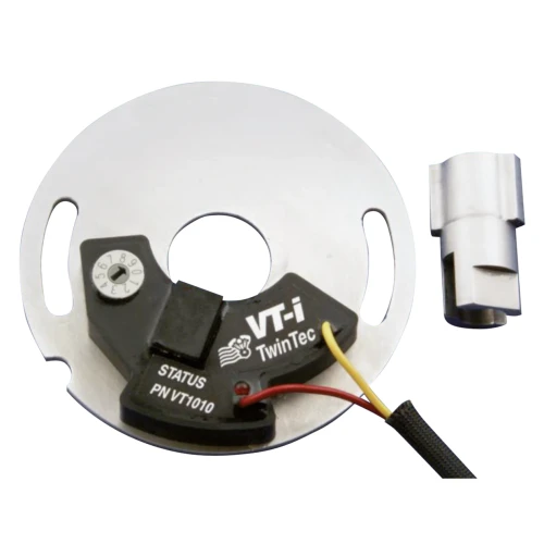 Ultra reliable dual fire electronic ignition system 1970 thru 1984 Shovelhead, 1984 thru 1999 Evolution Big Twin and 1978 thru 2003 Sportsters. The ignition includes a special trigger rotor for use with the stock mechanical advance mechanism. The VT-i ignition features a precise digitally set RPM limiter (200 RPM steps from 5.200 to 7.000 RPM), a status LED for easy static timing, electronic dwell control for maximum ignition energy at high RPM and reduced current draw at low RPM. The VT-i is compatible with most original equipment and aftermarket dual fire ignition coils with 3 to 5 ohms primary resistance. Apart from the very easy installation with just two wires to hook up to the coil one of the biggest advantages of this ignition is that it operates down to below 6 volts for reliable starting under all conditions, including kick start.