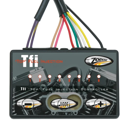 The "TOP Fuel Injection" adjustable fuel injection tuner is a load-based fuel injection module that does not require any splicing of your wire harness or making other permanent modifications to your bike. The "TOP Fuel Injection" comes pre-loaded with base maps for every particular model which than can be fine-tuned for your bike and individual riding style with three buttons. Tuning your fuel injection this way is even easier than tuning a carburetor. You don't need a computer nor a dyno to maximize your bike's performance. Utilizing the latest in load-based technology in fuel injection performance, the "TOP Fuel Injection" detects the exact amount of load on the engine at any speed and any RPM, delivering the perfect amount of fuel to the engine for optimum performance. This makes the design superior over fuel injection modules that work off of throttle position, as throttle positions can be the same at different speeds and with different loads on the engine. With the same amount of fuel injected into the engine in varying conditions, performance will never be as good as it will be when you have installed the Zodiac "TOP Fuel Injection" tuner. Great on stock bikes but strongly recommended for use on bikes with performance air cleaner and/or performance exhaust installed. Available for all injection models.