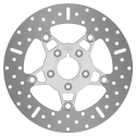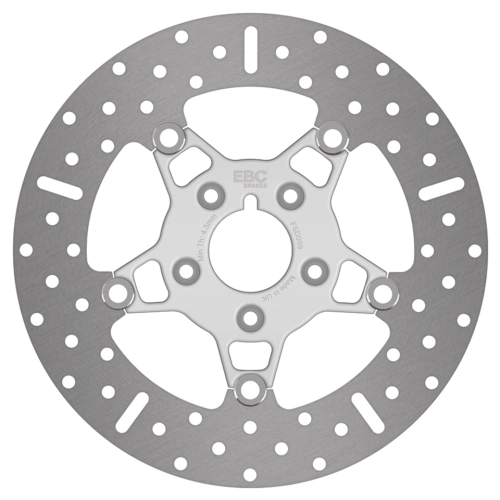 EBC produces a complete range of floating and non-floating disc brake rotors for modern Big Twin and Sportsters. EBC rotors are made in the UK using stainless steel for the brake rotor itself and polished or black stainless steel center hubs. EBC has opted for stainless steel center hubs due to the weight and heavy duty nature of larger American motorcycles. Floating rotors are assembled using the unique EBC SD System square drive button technology. EBC front floating rotors feature 5 buttons whereas rear rotors include 10 drive buttons to provide a sturdy looking and robust unit worthy of its heavy duty application. EBC strongly recommends to always use new pads when replacing rotors as the use of old or worn pads can cause hot spots or glazing of the rotor and will promote brake fade and loss of brake. EBC brake pads can be found elsewhere in this catalog. EBC offers a range of 5 spoke solid brake rotors and a choice of 5 spoke floating rotors in full circle rotor design or contoured profile rotor design. Discs are available in "Wide Band" for use with stock or stock style calipers or "Narrow Band" for use with aftermarket calipers.
