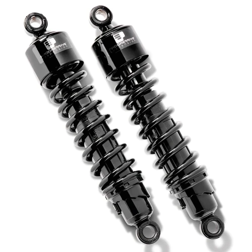 Progressive Suspension shocks are real quality and feature chrome or black powder coat finish, double wall construction, 6-stage damping, heat-treated hardchrome rods, long-life seals and fade resistant oil. Shocks come with a one year warranty on the shocks and a lifetime warranty on the springs. Sold in pairs. Available in various designs with the same technical details. Shocks with Regular springs will accommodate most riders needs. For some models we also have shocks with Heavy-Duty springs available. Springs for those who want to upgrade from Regular to Heavy-Duty are listed elsewhere in this chapter. Your model motorcycle is given together with the stock shocks length, feel free to take longer or shorter shocks from the same application group, but note that shorter than stock shocks will lower the rear of the motorcycle. Fender to tire clearance should be checked after installation.