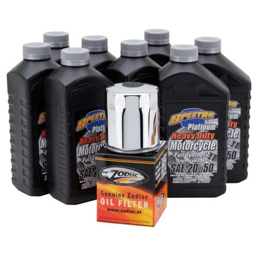 Easy does it! Just one part number to get everything you need for an engine oil change, a complete oil change or an oil change complete with a spark plugs change. We have selected for you the right type of Spectro oils, volumes, right oil filter in black or chrome and put these together in one box. We also have kits that include the correct spark plugs. And for the most demanding riders with a 2006 or later 6-speed transmission we have Platinum Plus kits available that include Spectro's special formulated noise-killing Platinum Gear oil. All kits are available with your choice of chrome plated oil filter or black painted oil filter.