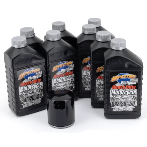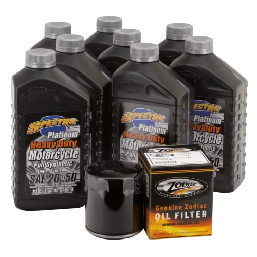 Easy does it! Just one part number to get everything you need for an engine oil change, a complete oil change or an oil change complete with a spark plugs change. We have selected for you the right type of Spectro oils, volumes, right oil filter in black or chrome and put these together in one box. We also have kits that include the correct spark plugs. And for the most demanding riders with a 2006 or later 6-speed transmission we have Platinum Plus kits available that include Spectro's special formulated noise-killing Platinum Gear oil. All kits are available with your choice of chrome plated oil filter or black painted oil filter.