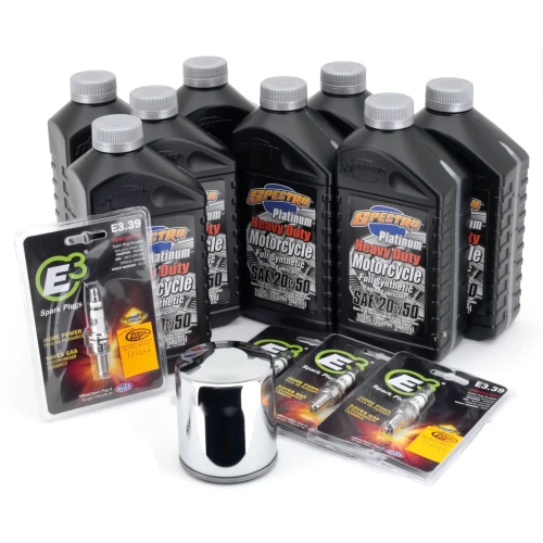 Easy does it! Just one part number to get everything you need for an engine oil change, a complete oil change or an oil change complete with a spark plugs change. We have selected for you the right type of Spectro oils, volumes, right oil filter in black or chrome and put these together in one box. We also have kits that include the correct spark plugs. And for the most demanding riders with a 2006 or later 6-speed transmission we have Platinum Plus kits available that include Spectro's special formulated noise-killing Platinum Gear oil. All kits are available with your choice of chrome plated oil filter or black painted oil filter.