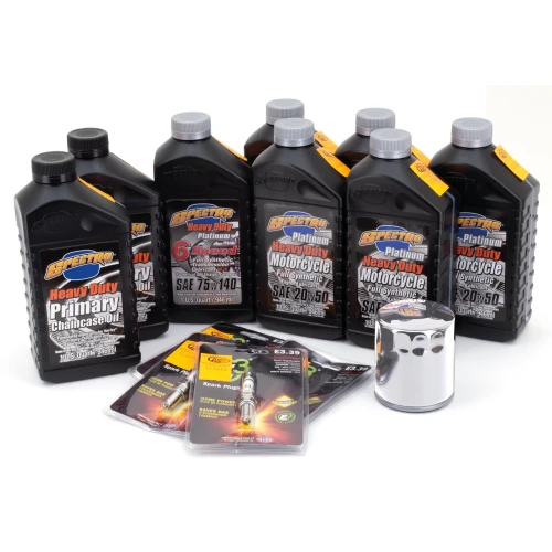 Easy does it! Just one part number to get everything you need for an engine oil change, a complete oil change or an oil change complete with a spark plugs change. We have selected for you the right type of Spectro oils, volumes, right oil filter in black or chrome and put these together in one box. We also have kits that include the correct spark plugs. And for the most demanding riders with a 2006 or later 6-speed transmission we have Platinum Plus kits available that include Spectro's special formulated noise-killing Platinum Gear oil. All kits are available with your choice of chrome plated oil filter or black painted oil filter.