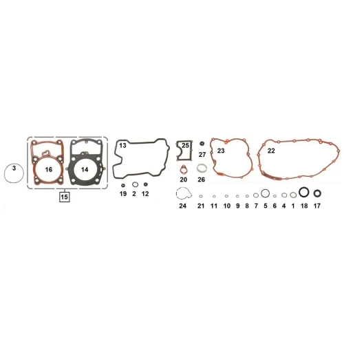 Complete kits, head- and base gaskets do not fit XG500 Street models, all others do fit the XG500. Except where indicated differently all parts are sold each. Kits come with 2015-style rocker box gaskets and seals and can, apart from these, also be used for later models. Required quantities for individual gaskets, seals and o-rings are indicated between parenthesis, for example like (2).