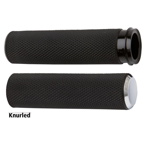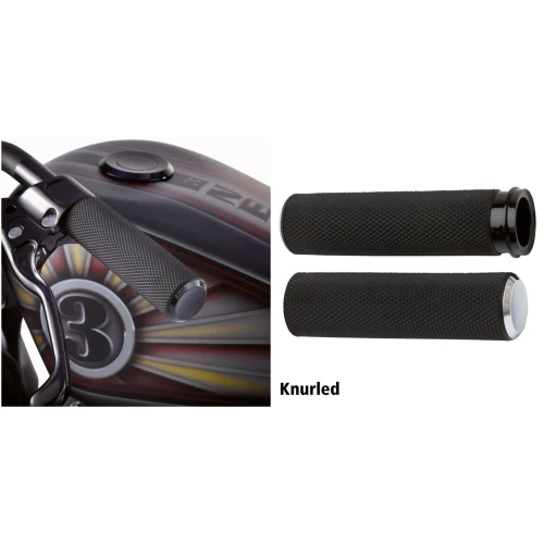 The perfect fusion of grip, style and comfort. Each rubber grip design features excellent traction for your hands to take full control of your motorcycle. Collars, rings and end caps are machined from billet aluminum, accents are finished in chrome or anodized black. All kits include an installed throttle sleeve, grip glue and simple to follow instructions.