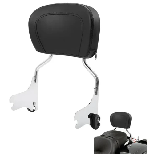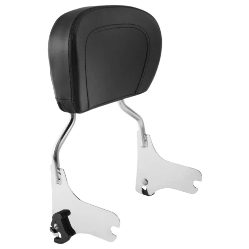 Sissy bar is 11 1/2" (29cm) high without the pad, with the pad fitted it is some 5" (13cm) higher. The black vinyl pad is 8" (20cm) high and 11 1/2" (26cm) wide, Order required docking point kit separately. Does not fit with rigid mounted Tour Pak.