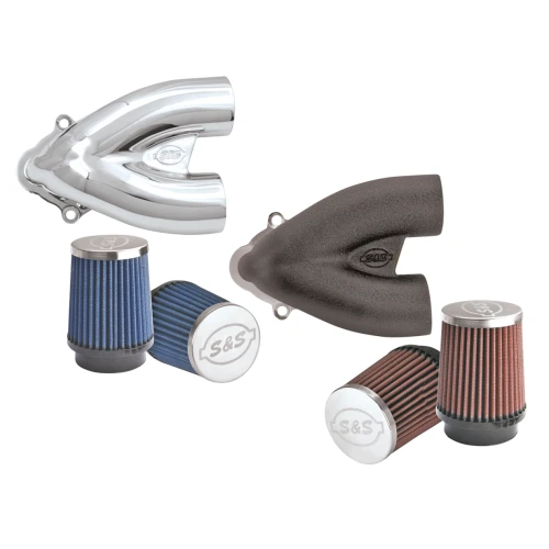 The S&S single bore tuned induction system is cool looking and delivers a healthy boost in midrange torque. Peak horsepower is also increased. The tuned runner system makes even more horsepower than an S&S teardrop air cleaner. Performance increases are across the board for stock and big inch engines alike. The heart of the single bore tuned induction system is the dual runner, two-into-one intake. The tuned runners are very similar in appearance to the dual runner intake for our dual bore induction system, but the design allows for more flexibility. Instead of bolting directly to a throttle body, the runners of the single bore induction join together in a smooth, flow enhancing curve and the unit bolts to an adaptor bracket. A variety of adaptor brackets make it compatible with lot of different engine styles. Kits are actually composed of two kits: one with the induction runners and filter, the other woth the adaptor bracket, breather and required hardware.