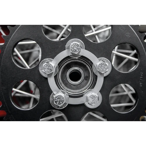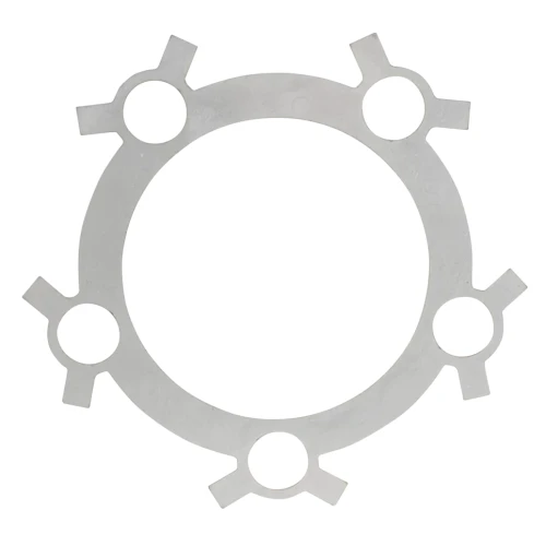 This locking tab washer is designed specifically for securing the mounting hardware for the rear wheel pulley or sprocket on Big Twin and Sportster, as well as Buell. Tabs are made in the USA out of stainless steel and have a tumbled finish. Installation is quick and easy: clean your hardware and threads, use red loctite and torque to factory specifications, with this washer in place under the bolt heads. Bend the tabs up to engage the head of each bolt. This is a physical lock to ensure that the mounting bolts cannot back out and loosen up on you. We recommend replacing the washer after it has been used to ensure the tabs do not break off from repeated bending.