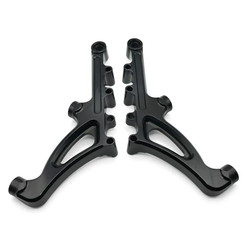 Method fork sliders feature a performance based design with integrated features that help elevate the style and handling of Touring models. They feature an integrated "No Flex" fork brace that flows seamlessly with the lines of the fork legs, adding rigidity & stability to the front end for improved handling. These fork sliders accept both factory & aftermarket performance suspension internals and come with billet 12-point style axle nuts, fork seals and dust seal covers. The brake caliper mounts are designed for factory size 11.8" (300mm) brake rotors and also accept up to 14" oversized discs. Designed for 18" to 19" front wheels, 21" front wheels require custom fender- and fork brace spacers.