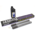 Hyperpro has put years of extensive Research & Development on front forks, shocks, springs and suspension systems. As most of the time a linear spring is either too hard or too soft at the beginning and/or at the end, a so called one-step progressive spring is an improvement, but is still a compromise between comfort and safety. The sudden change from soft to hard is often felt as a disadvantage and can lead to "speed wobbles". Hyperpro came up with the noncompromising solution: the "Link-System Curve Design" for springs. With this construction a spring can be designed to satisfy all the demands of modern motorcycle technology. Hyperpro gives you a sensitive initial part of the stroke with a smoothly increasing spring rate for safety and anti-dive at the end of the stroke. Together with the use of the highest quality materials and precision machining this results in the best springs that money can buy. The fork springs are manufactured to DIN-2095, class 1 and are specially polished for minimal friction and carry a lifetime warranty against breaking. The shock springs provide superior roadholding & handling under all conditions and are thoroughly tested on a computerized dyno and on the bike in question. They are available with a black or purple polyester surface and the same technical standards as the fork springs. Front fork kits come complete with springs, one liter Hyperpro suspension-fluid, a small tube Hyperpro fork seal lubricant, and a professional manual with suspension tips.