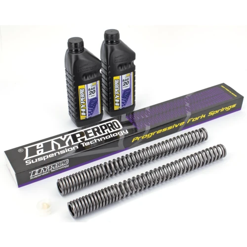 Hyperpro has put years of extensive Research & Development on front forks, shocks, springs and suspension systems. As most of the time a linear spring is either too hard or too soft at the beginning and/or at the end, a so called one-step progressive spring is an improvement, but is still a compromise between comfort and safety. The sudden change from soft to hard is often felt as a disadvantage and can lead to "speed wobbles". Hyperpro came up with the noncompromising solution: the "Link-System Curve Design" for springs. With this construction a spring can be designed to satisfy all the demands of modern motorcycle technology. Hyperpro gives you a sensitive initial part of the stroke with a smoothly increasing spring rate for safety and anti-dive at the end of the stroke. Together with the use of the highest quality materials and precision machining this results in the best springs that money can buy. The fork springs are manufactured to DIN-2095, class 1 and are specially polished for minimal friction and carry a lifetime warranty against breaking. The shock springs provide superior roadholding & handling under all conditions and are thoroughly tested on a computerized dyno and on the bike in question. They are available with a black or purple polyester surface and the same technical standards as the fork springs. Front fork kits come complete with springs, one liter Hyperpro suspension-fluid, a small tube Hyperpro fork seal lubricant, and a professional manual with suspension tips.