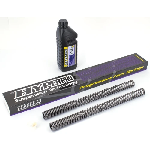 Hyperpro has put years of extensive Research & Development on front forks, shocks, springs and suspension systems. As most of the time a linear spring is either too hard or too soft at the beginning and/or at the end, a so called one-step progressive spring is an improvement, but is still a compromise between comfort and safety. The sudden change from soft to hard is often felt as a disadvantage and can lead to "speed wobbles". Hyperpro came up with the noncompromising solution: the "Link-System Curve Design" for springs. With this construction a spring can be designed to satisfy all the demands of modern motorcycle technology. Hyperpro gives you a sensitive initial part of the stroke with a smoothly increasing spring rate for safety and anti-dive at the end of the stroke. Together with the use of the highest quality materials and precision machining this results in the best springs that money can buy. The fork springs are manufactured to DIN-2095, class 1 and are specially polished for minimal friction and carry a lifetime warranty against breaking. The shock springs provide superior roadholding & handling under all conditions and are thoroughly tested on a computerized dyno and on the bike in question. They are available with a black or purple polyester surface and the same technical standards as the fork springs. Front fork kits come complete with springs, one liter Hyperpro suspension-fluid, a small tube Hyperpro fork seal lubricant, and a professional manual with suspension tips.