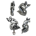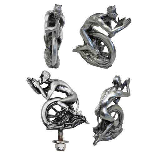 Devil and wheel fender ornament is pewter type metal with a silver finish and is to be mounted with the included 1/4"-20 threaded stud. Height 2 3/4" (7cm), length: 2 1/8" (5.4cm), width 3/4" (1.9cm).