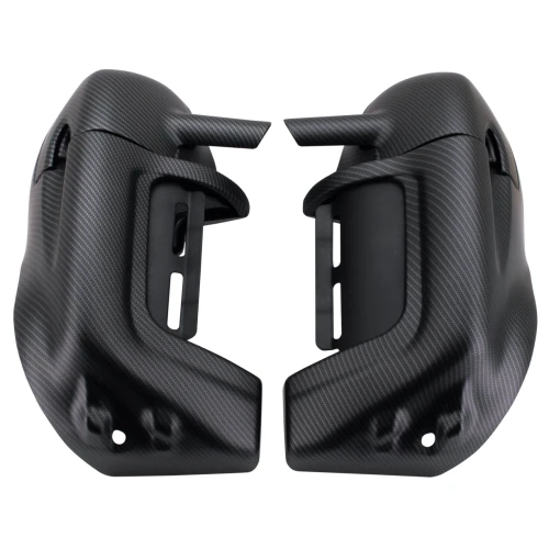 Fairing lowers made from vacuum-formed ABS with a matt or gloss carbon look finish. They not only help to protect the rider from the elements but also direct cooling air to the engine. Lowers come with glove boxes and attach straight to the original fitted "straight top" engine guard with the included mounting hardware. Does not fit with Mustache or Chopped engine guards.