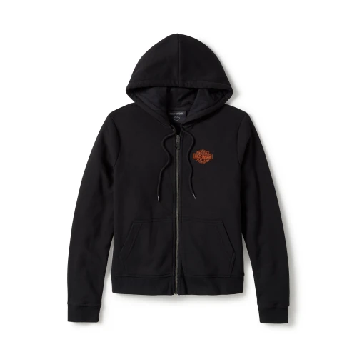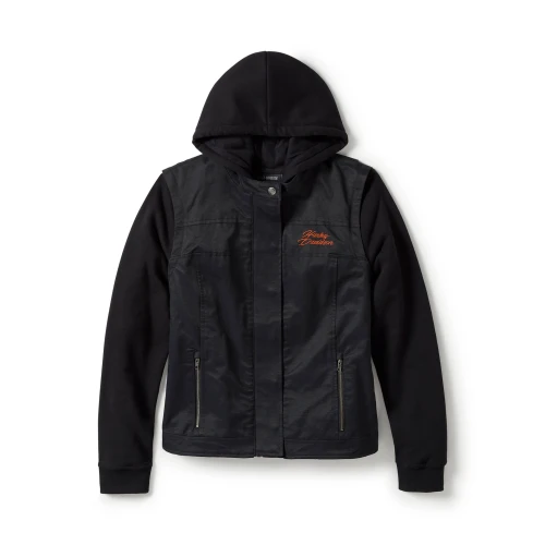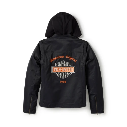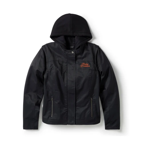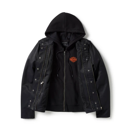 Enhanced style, comfort, and versatility all converge on this latest Miss Enthusiast 3-in-1 Textile Jacket. The outerwear layer is cut from heavyweight cotton/nylon oxford and now features zip-off sleeves to wear as a vest, plus an extended snap-tab collar. We’ve also upgraded the hoodie with an added zipper that secures to the jacket/vest and a drawcord that tucks into the hood so it won’t flap around under your riding gear. Wear the jacket alone, the vest alone, the hoodie alone, or combine them together—either way it’s a must-have for rides, road trips, and rallies. It’s all classically embroidered with our graphics for an iconic Harley-Davidson look. Snag yours now while supplies last.