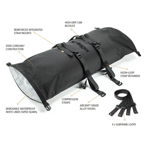 Kriega ROLLPACKS er tilgjengelig i 2 størrelser og 5 fargealternativer, det perfekte tilbehøret for enhver motorsyklist som leter etter en tøff, enkel og universal oppbevaringsløsning. Vesken er konstruert av 420D Cordura® LITE og har et vanntett innerfor som kan tas ut. Vesken er bygget for å tåle de tøffeste forhold, og gir maksimal beskyttelse for eiendelene dine. Den doble rulletopp-lukkingen gir en fleksibel vanntett løsning med enkel tilgang fra begge ender. ROLLPACK er designet for å passe på baksetet eller bagasjebrett. For rask og enkel montering dras de integrerte stroppene rundt ramme og tilbake til vesken. I tillegg er Subframe-Loops inkludert for motorsykler uten synlig ramme eller baggasje stativ. Når den er montert på sykkelen, hekter du bare de integrerte stroppene på Subframe-løkkene og stram til.