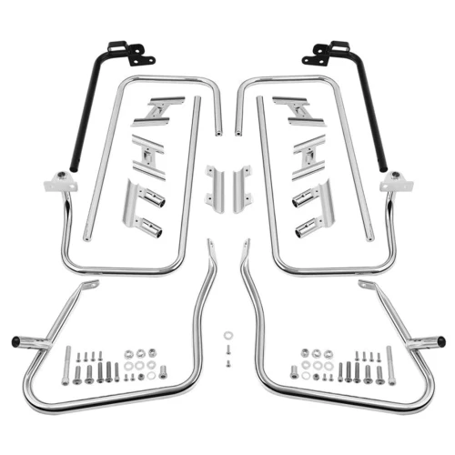 Saddlebag guard kits with left and right horizontal bars, left and right leading edge bars, as well as the necessary hardware and mounting instructions.