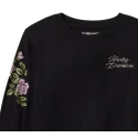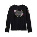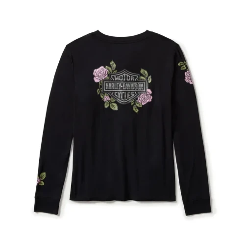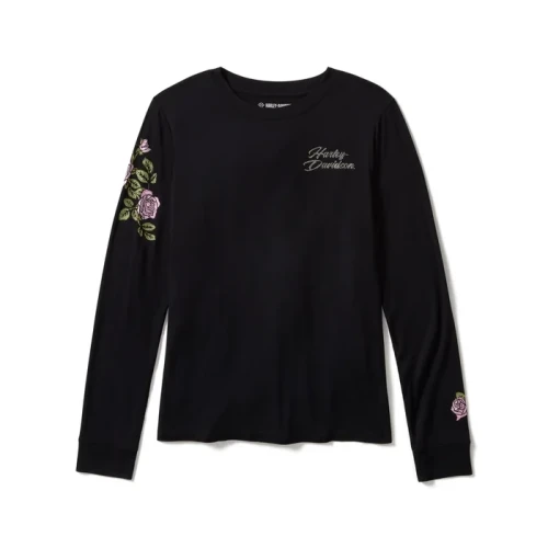 H-D style is in full bloom on our limited-issue Rose & Thorn Bling Long Sleeve Top. Cut from rayon jersey with a hit of spandex for a smooth silky feel that’s wrinkle-free, so it’s a must-pack item in your saddlebag or suitcase. Attractively finished with embellished graphics that fuse our moto legacy with distinctive floral designs. Get yours now before they’re gone.